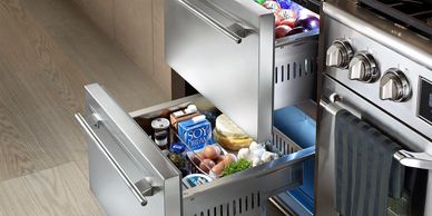 These extraordinary frameless European style cabinets are "Made in the USA," by the latest automated CNC laser-cutting technology, using either 304 stainless steel or upgraded 316 stainless steel, all featuring 'polished' stainless steel drawer interior surfaces and soft/self-close double-wall doors.